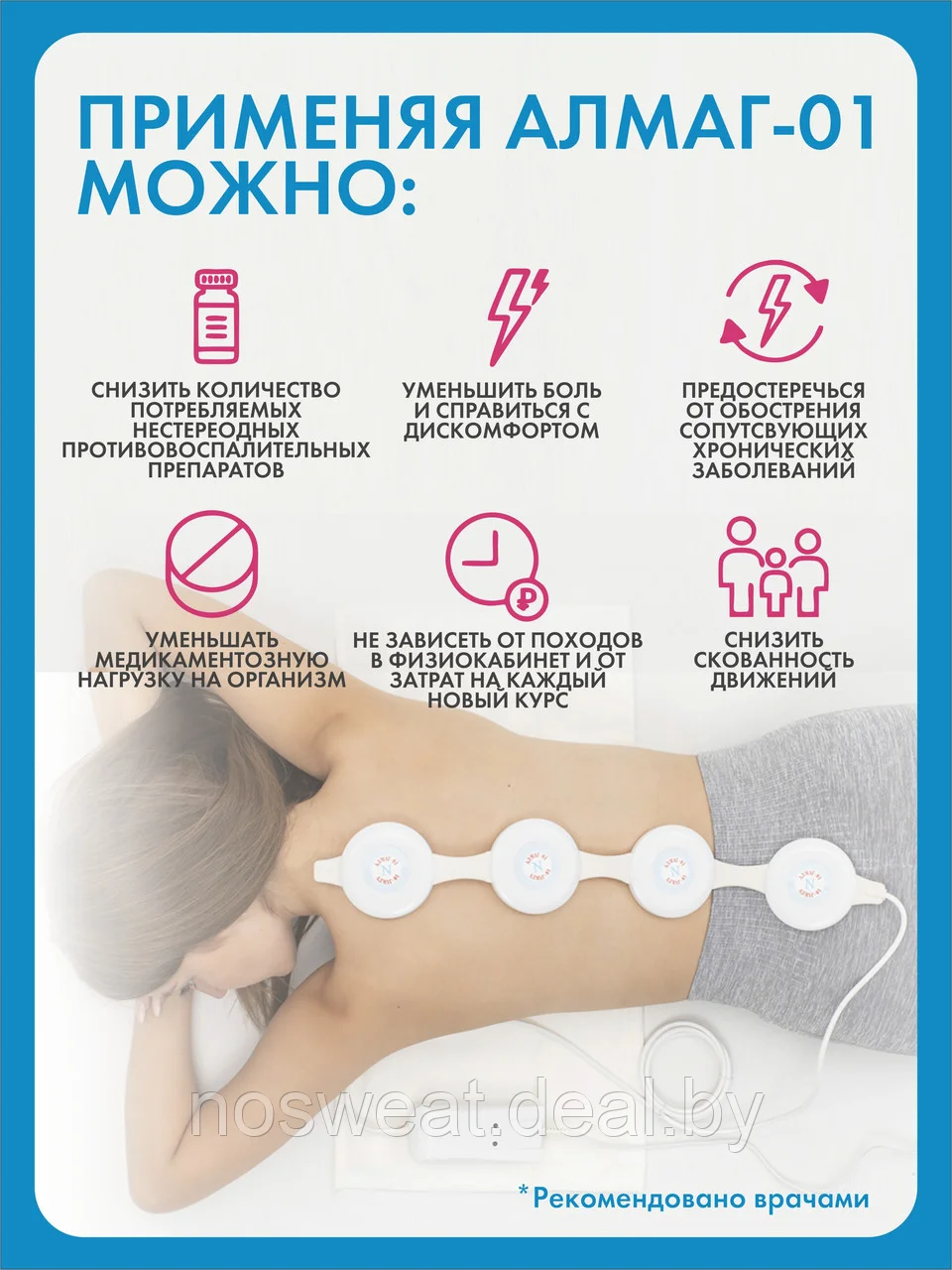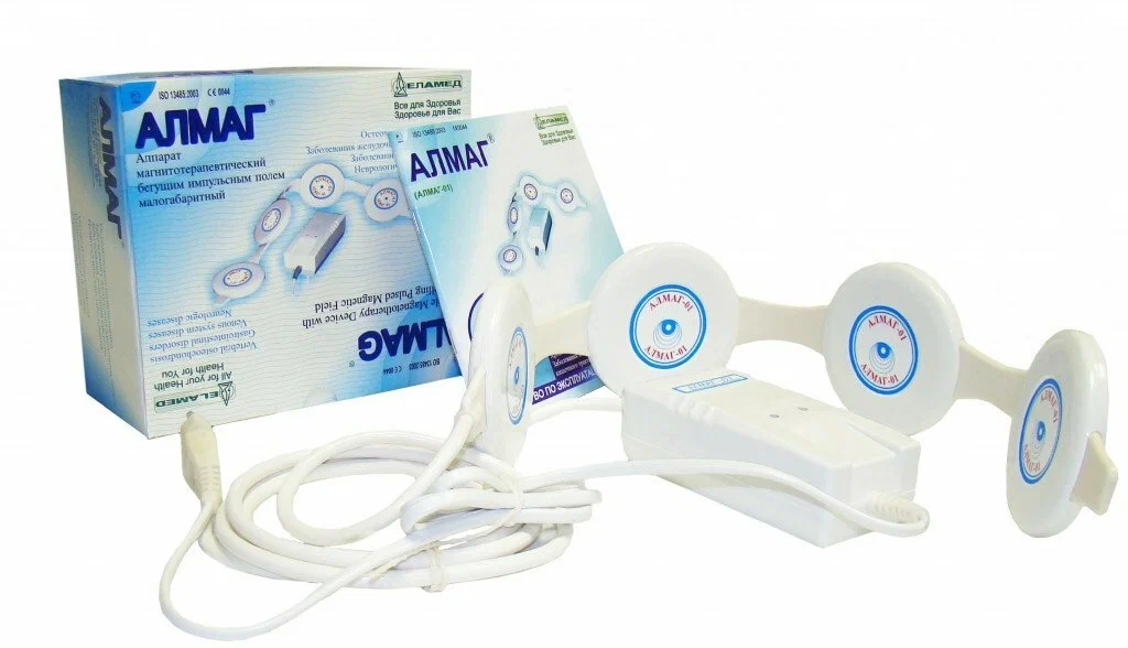 Магнитотерапевтический аппарат АЛМАГ-01 подходит для стационарного и домашнего лечения, а также профилактики более 50 типов заболеваний — от остеохондроза до гастрита. Это устройство использует бегущее магнитное поле для лечения разнообразных недугов. АЛМАГ-01 можно использовать отдельно – на ранней стадии заболевания или для профилактики. А в составе лечебного комплекса его действие направлено на усиление общего эффекта.