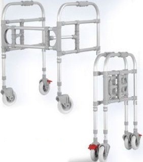 Данная модель ходунков для удобства перемещения оснащена 4-мя резиновыми колесами из которых передняя пара — поворотные, а задние оснащены тормозом.