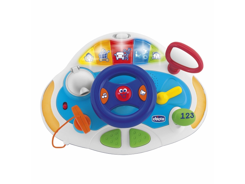 На панели автобуса установлена многофункциональная русско — английская музыкальная панель от Chicco.