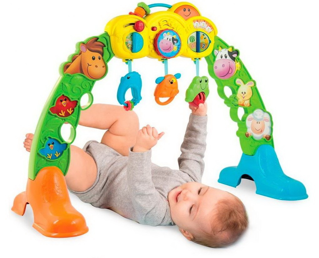 В разложенном виде, лежащий малыш может играть в Мини-Тренажерный зал.